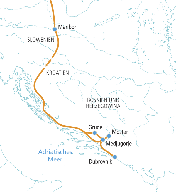 Nach einer letzten Messe in Grude nehmen Sie Abschied von Medjugorje. Durch Kroatien führt die Fahrt nach Maribor, wo Sie noch einmal übernachten.