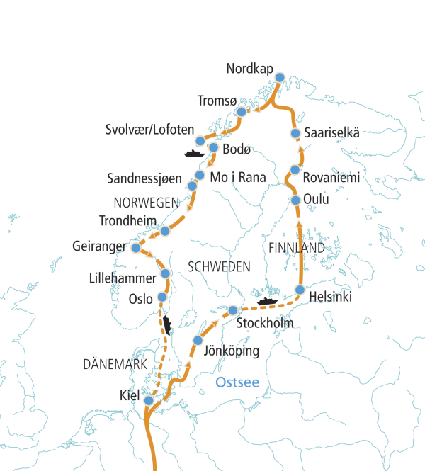 Weit, wilder, nordischer – diese Traumroute führt Sie über die schönsten Panoramastraßen Skandinaviens bis dorthin, wo Europa endet: am sagenumwobenen Nordkap. Erleben Sie eine großartige Rundreise durch Schweden, Finnland und Norwegen – voller Kontraste und Magie. Lebendige Hauptstädte, tiefblaue Seen und endlose Wälder begleiten Sie ebenso wie das goldene Licht der Mitternachtssonne, die stillen Fjorde und die ungezähmte Schönheit der Lofoten. Diese Reise vereint alles, was den Norden so unvergleichlich macht: Kultur und Natur, Weite und Geborgenheit, Mystik und Lebensfreude.Lassen Sie sich entführen auf eine unvergessliche Reise durch die magische Vielfalt Skandinaviens – ein Abenteuer zwischen Himmel und Meer, das Sie nie wieder loslassen wird!