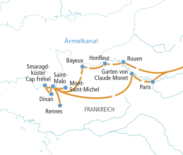 Kommen Sie mit auf eine der abwechslungsreichsten Reisen! Sehen Sie die absoluten Highlights, wie den Mont-Saint-Michel oder Giverny, weite Felder, pittoreske Häfen, Meeresfrüchte und wilde Strände. Freuen Sie sich auf frischen Wind und wellenumspülte Klippen, auf kulturelle und kulinarische Köstlichkeiten! Das typisch bretonische Flair von St. Malo wird Sie mit seinen Spezialitäten zum abendlichen Bummel verführen.