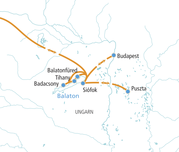 Der Balaton – der größte See Mitteleuropas – wird auch das „ungarische Meer“ genannt. Glitzerndes Wasser, liebliche Weinberge und gastfreundliche Menschen machen ihn zu einem Ort voller Lebensfreude. Diese Reise führt Sie von den Donau-Städten bis in das Herz der ungarischen Puszta, wo Tradition und Herzlichkeit lebendig geblieben sind.
