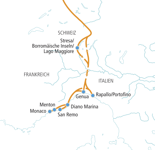 Verlassen Sie die Autobahn und lassen Sie sich von der Schönheit der Küstenstraße verzaubern. Erleben Sie das authentische Italien, mediterranes Flair und unvergessliche Momente! Diese Reise verbindet die Magie des Lago Maggiore mit den strahlenden Highlights der italienischen Riviera – ein Erlebnis zwischen glitzerndem Wasser, Palmen, Blumen und Lebensfreude!