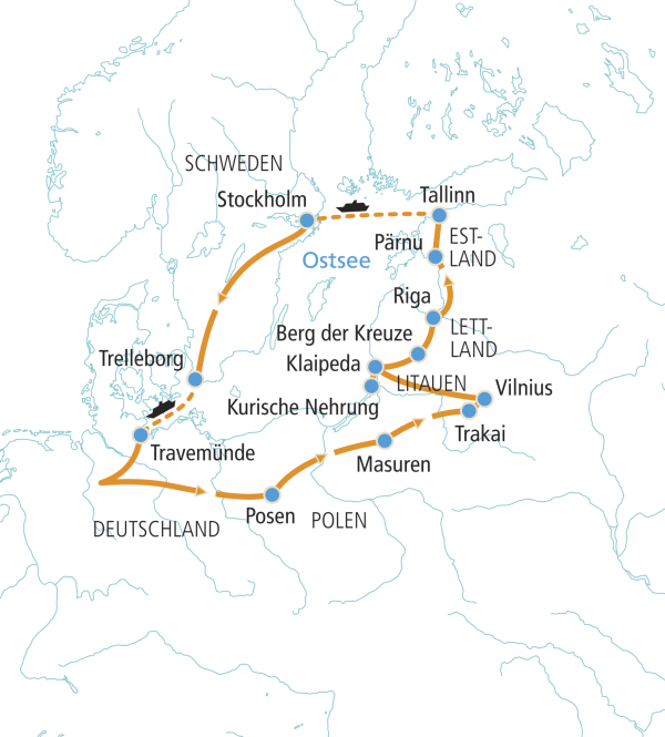 Ein Höhepunkt der Reise erwartet Sie: die Kurische Nehrung. Eine kurze Schifffahrt bringt Sie auf die Landzunge mit ihren mächtigen Wanderdünen, Kiefernwäldern und Fischerdörfern. Nach dem Besuch des Berges der Kreuze, einer eindrucksvollen Pilgerstätte, erreichen Sie Riga, die Hauptstadt Lettlands.